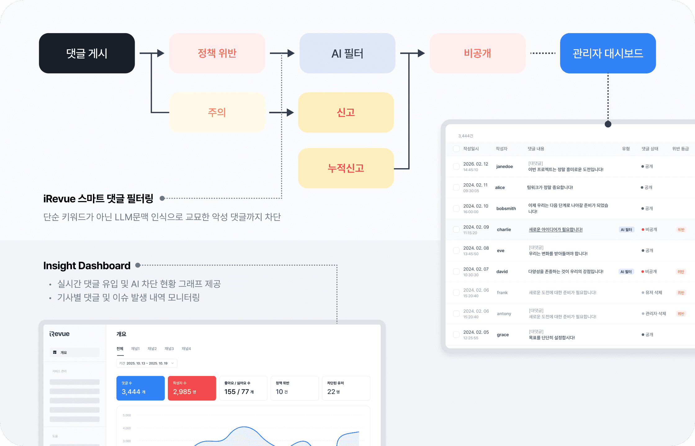 아이리뷰 AI가 24시간 문맥을 파악해 악성 콘텐츠를 선제 차단하며,