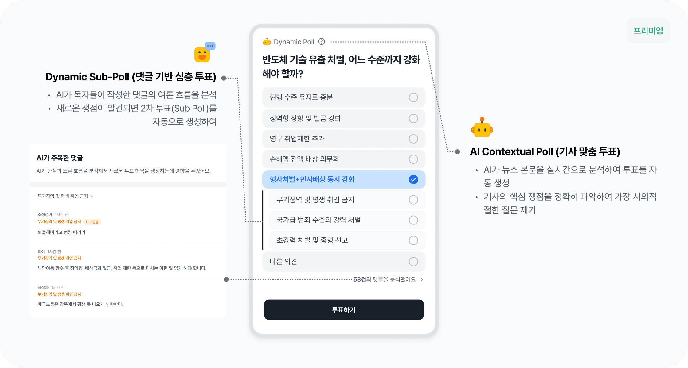 단순히 댓글만 달게 하지 마세요. AI가 기사를 읽고 투표를 만들고, 댓글 흐름을 읽어 새로운 논쟁거리를 던집니다.