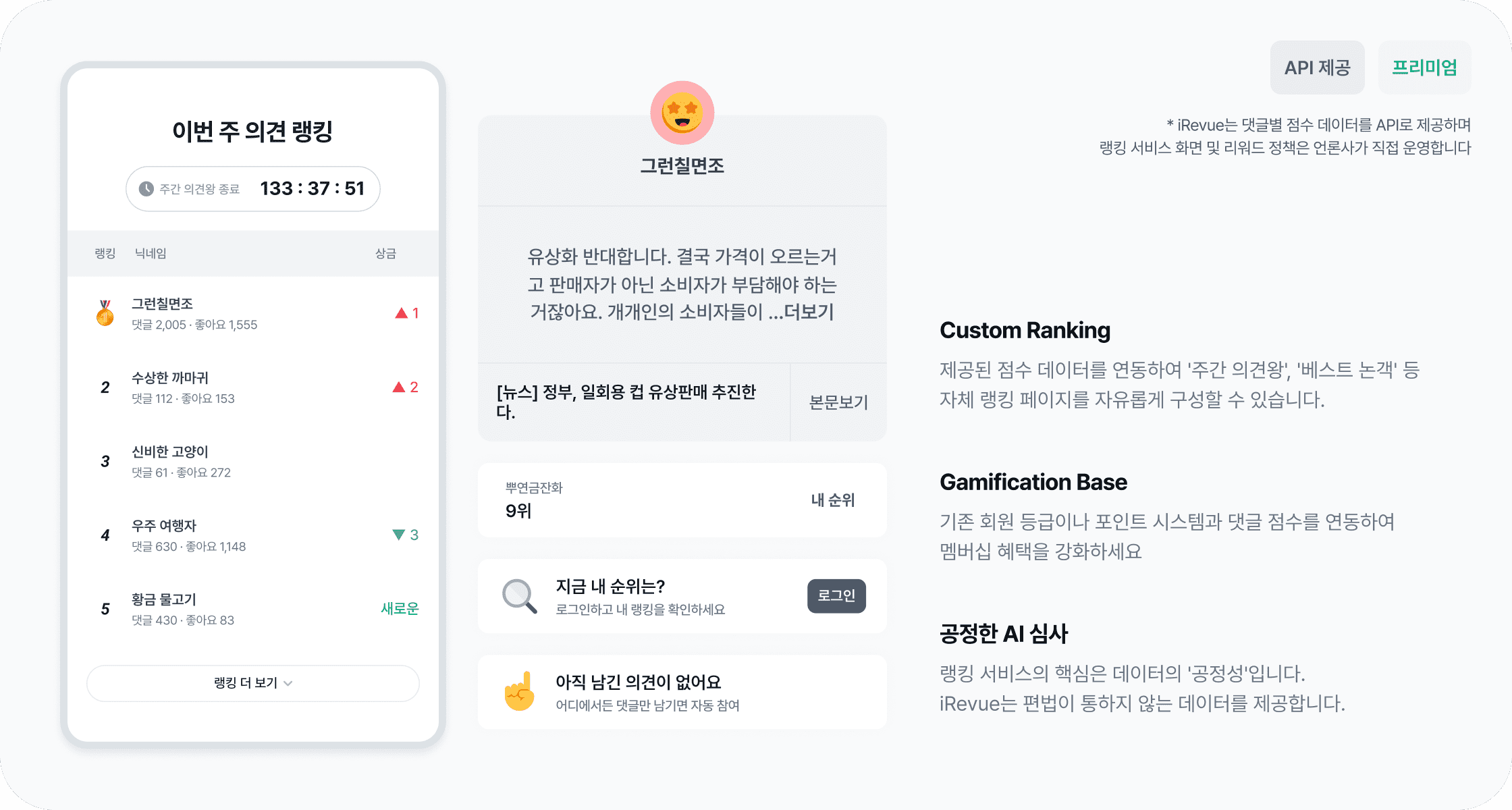 단순한 의견 나열은 독자를 붙잡을 수 없습니다. 아이리뷰가 제공하는 '댓글 품질 점수 데이터(Scoring API)'를 활용하여,