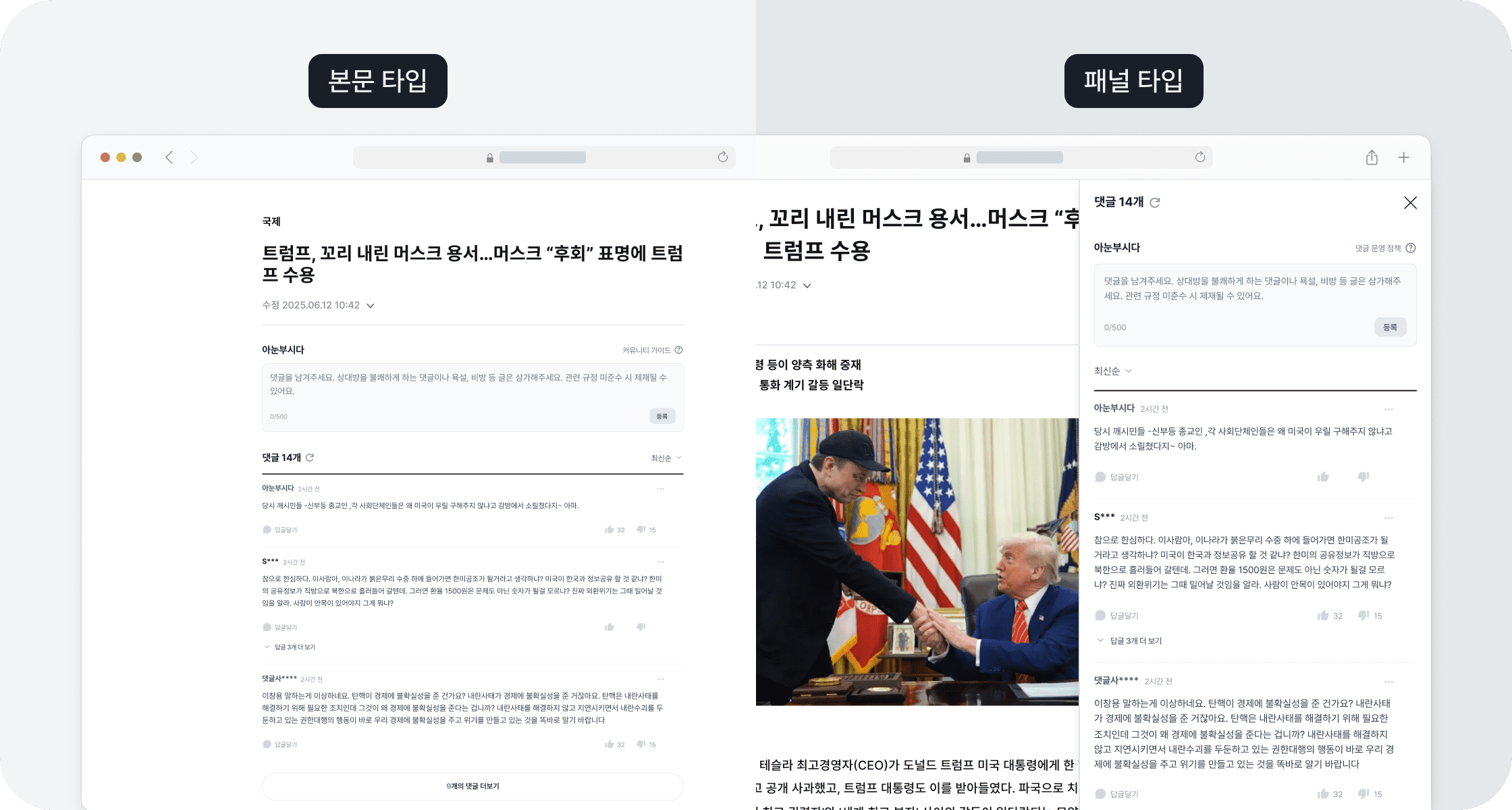 독자의 참여를 유도하여 체류 시간을 극대화하고 여론 데이터를 확보할 수 있습니다.